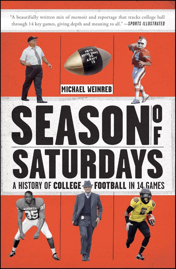 “College football is a confounding sport with an arcane history at the intersection of higher education, the twilight of adolescence, and semi-professional football, all institutions of questionable integrity. The mix is captured and explained beautifully in Michael Weinreb’s new book Season of Saturdays….required reading.”—The Washington Free Beacon